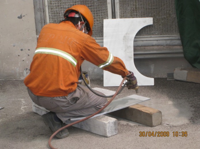 圖中為美國海灣大橋項目中美方監(jiān)理對涂裝試板的噴砂確認(rèn)