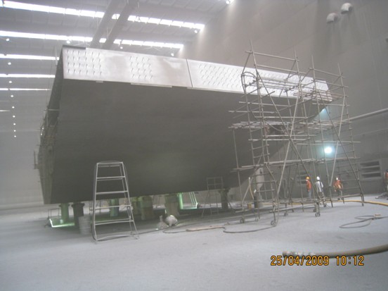 圖中為美國海灣大橋的分段底漆后的面漆霧噴施工,要求膜厚25-50微米