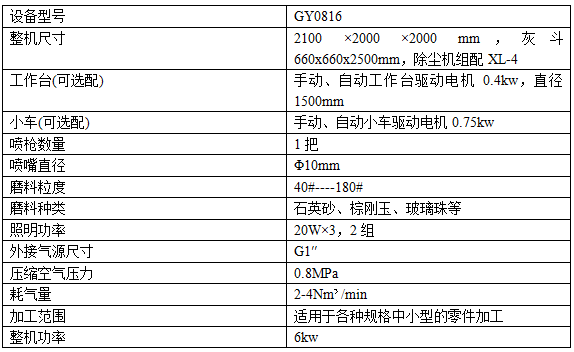 本機(jī)適合工件尺寸為0.8x0.8米左右的工件噴砂,也可作型材、焊件外壁噴砂 1、適用于圓盤類、小塊玻璃、五金制品的表面噴砂 2、工作臺(tái)車自動(dòng)進(jìn)出艙體,工作臺(tái)自動(dòng)旋轉(zhuǎn) 3、噴槍做水平或者擺掃運(yùn)動(dòng) 4、噴槍垂直方向距離工件位置可以調(diào)整